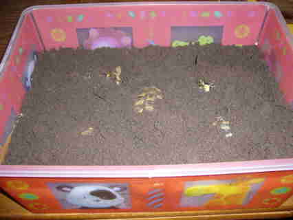 - Füllen Sie die Box so hoch mit angefeuchtetem Spaghnummoos, dass das Tier sich vollständig eingraben kann. Sie können die Box auch mit feuchter Gartenerde (nicht naß!) oder mit feuchter Terrariumerde füllen.